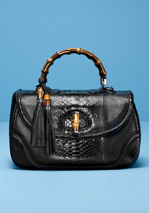 이그조틱 레더에 견고한 대나무 손잡이와 태슬, 버클 장식으로 고급스럽게 완성한 뉴 뱀부 백. 예단 백으로 추천한다. 36X22cm, 8백75만원 구찌.