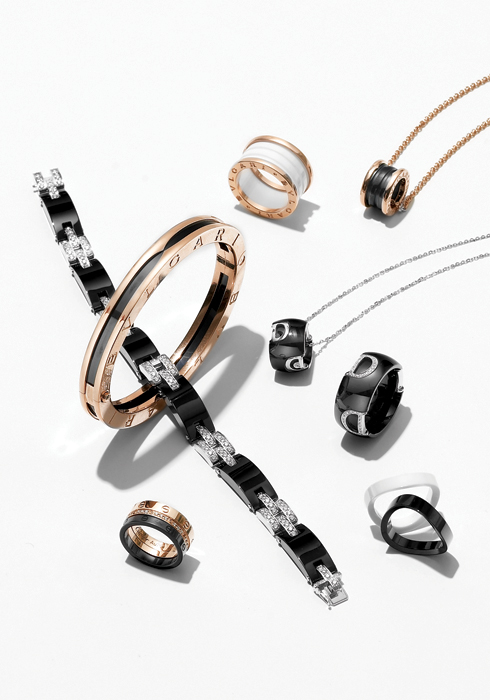 화이트 세라믹과 핑크 골드를 세팅한 불가리 비.제로원 링 1백만원대, 블랙 세라믹 비.제로원 네크리스 3백만원대 모두 불가리.