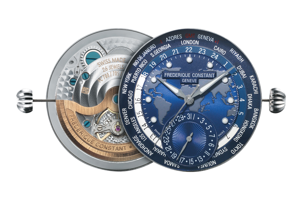 2015년 바젤월드에서 프레드릭 콘스탄트는 그 어느 때보다 다양한 시도를 꾀했다. 용두 하나로 세 가지 포지션을 조정할 수 있는 월드타이머 워치부터 얇은 무브먼트와 문페이즈를 결합한 여성 컬렉션, 그리고 첨단 기술을 접목한 스마트 워치, 마지막으로 조디악을 접목한 워치까지, 다양한 모티브와 기술력을 결합해 보는 이를 경탄케 했다. 먼저 ‘클래식 매뉴팩처 월드타이머 컬렉션’ 워치는 42시간의 파워 리저브가 가능한 FC-718 매뉴팩처 셀프 와인딩 칼리버로, 제네바 플랑-레-주아트(Plan-les-Ouates)에 위치한 매뉴팩처에서 인하우스로 개발되었다. 무엇보다 이 워치의 특징은 용두 단 하나로 세 가지 포지션을 조정할 수 있어 시계 와인딩, 시간, 날짜 세팅뿐만 아니라 월드타이머와 같은 복잡한 기능을 손쉽게 구동할 수 있다는 것이다. 3시 방향의 크라운을 통해 원하는 도시를 선택한 후 12시 방향에 위치시키면 내부 디스크가 자동으로 설정되어 편리하게 다이얼에 표시된 24개 도시의 시간을 확인할 수 있다. 또 6시 방향에 위치한 카운터를 통해 날짜를 확인할 수 있다. 화이트 디스크인 경우 낮을 뜻하고, 블루 디스크는 밤을 뜻한다.