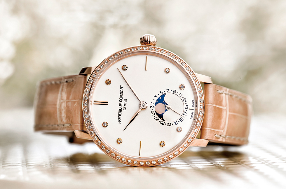 여성 컬렉션의 ‘레이디 슬림라인 문페이즈 매뉴팩처(Slimline Moonphase Manufacture)’ 워치는 60개의 다이아몬드를 세팅해 단숨에 여심을 사로잡았다. 다이아몬드와 더불어 클래식한 디자인이 특징인 이 워치에서 또 하나 주목할 점은 바로 케이스다. 슬림라인 컬렉션이라는 이름에 걸맞게 얇은 케이스 두께와 직경 38.8mm의 작은 사이즈로 여성 컬렉션으로서의 우아함을 더했다. 단 하나의 용두로 다양한 기능을 조정할 수 있다는 것도 빼놓을 수 없는 특징이다. 슬림라인 문페이즈 매뉴팩처 워치는 용두를 빼지 않은 상태에서 와인딩이 가능하며 시간, 날짜, 문페이즈 세팅을 용두 하나만으로 조정할 수 있어 편리함을 더했다. FC-703 매뉴팩처 셀프 와인딩 칼리버를 탑재해 42시간의 파워 리저브 기능을 부여했고, 정교한 무브먼트를 한눈에 확인할 수 있도록 시스루 케이스 백을 장착한 것이 특징이다.