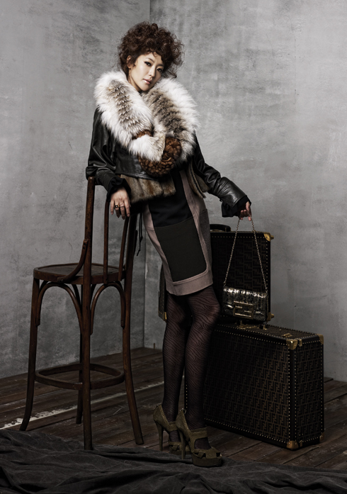 루스한 실루엣의 가죽 재킷 1천9백3만원, 미니멀한 스커트 1백12만원, 퍼 머플러 9백80만원, 구조적인 디자인의 슈즈 1백26만원, 메탈릭한 소재의 미니 바게트 백 95만원, 큰 사이즈 트렁크 3백47만원, 작은 사이즈 트렁크 5백72만원 모두 펜디. 오른쪽 가운데 손가락에 착용한 뻬를리 링 6백만원대 반클리프 아펠. 약지에 착용한 B.제로원 링 1백만원대 불가리.