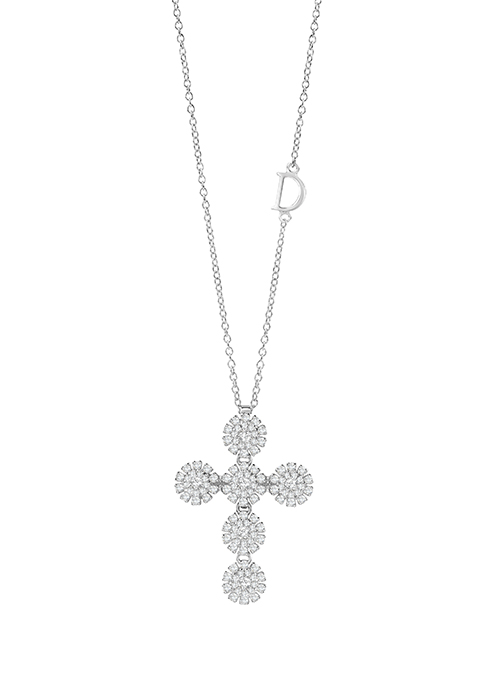 5 화이트 골드에 다이아몬드로 이뤄진 데이지 플라워를 십자 형태로 세팅한 마르게리타 네크리스.