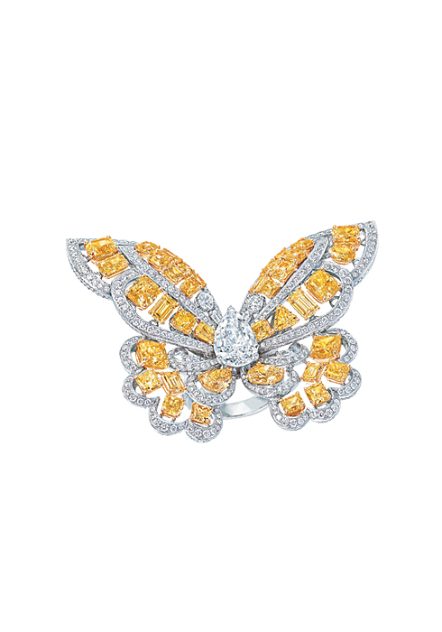 화려하면서도 정갈한 기품이 느껴지는 브로치 중에서 단연 돋보인 작품은 현 세기에 발굴된 원석 중 두 번째로 크다는 레츠엥 스타에서 나온 33.11캐럿의 서양배 모양 다이아몬드로 장식된 섬세한 ‘그라프 다이아몬드 버터플라이 브로치’. 이번에 아시아 최초로 전시됐다는 이 나비 브로치에는 총 86.42캐럿의 다이아몬드가 사용됐다. “배(pear)를 닮은 모양 자체도 그렇지만 최상의 품질을 뜻하는 D컬러 FL의 33.11캐럿 다이아몬드는 매우 특별한 가치를 지닙니다. 정말 아름답기도 하고요.” 이 전시회를 위해 홍콩에서 서울을 찾은 그라프 담당자 모니크 추는 이렇게 설명했다. 나비는 그라프의 브랜드 이미지와 자연스럽게 연동되는 상징적인 모티브다. 다이아몬드는 물론이고 사파이어, 에메랄드, 루비 등 다채로운 보석과 어우러진 나비 디자인의 매력은 일품이다. 우아한 나비가 무리를 지어 살아 움직이는 듯한 느낌을 표현했다는 ‘파베 버터플라이 컬렉션(Pave Butterfly Collection)’, 사랑스럽고 고아한 ‘클래식 버터플라이 컬렉션(Classic Butterfly Collection)’, 다채로운 모양의 옐로와 화이트 다이아몬드가 한 마리 노랑나비의 생기 있는 파닥임을 손가락 위에 재현해낸 듯한 반지 ‘옐로, 화이트 다이아몬드 버터플라이 링’ 등 다양한 나비 소재의 컬렉션은 뭇 여성들의 마음을 사로잡기에 충분했다.
