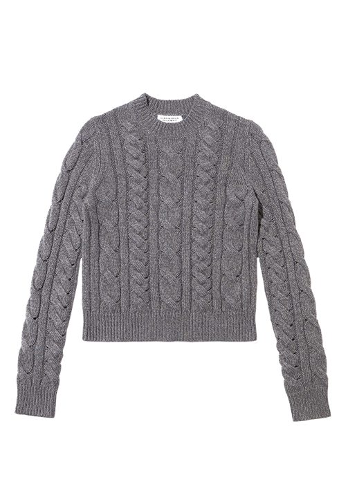 큰 케이블이 질감과 부피를 더해 주며 포인텔 홀이 가벼운 느낌을 주는 것이 특징인 엔시아 스웨터 1백97만원 가브리엘라 허스트.