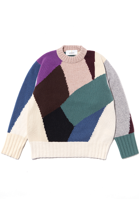 울 100%의 도톰한 소재감과 컬러 블록의 캐주얼한 느낌이 돋보이는 비베무스 꼴라주 니트 1백35만원 아키라 나카 by 폼.