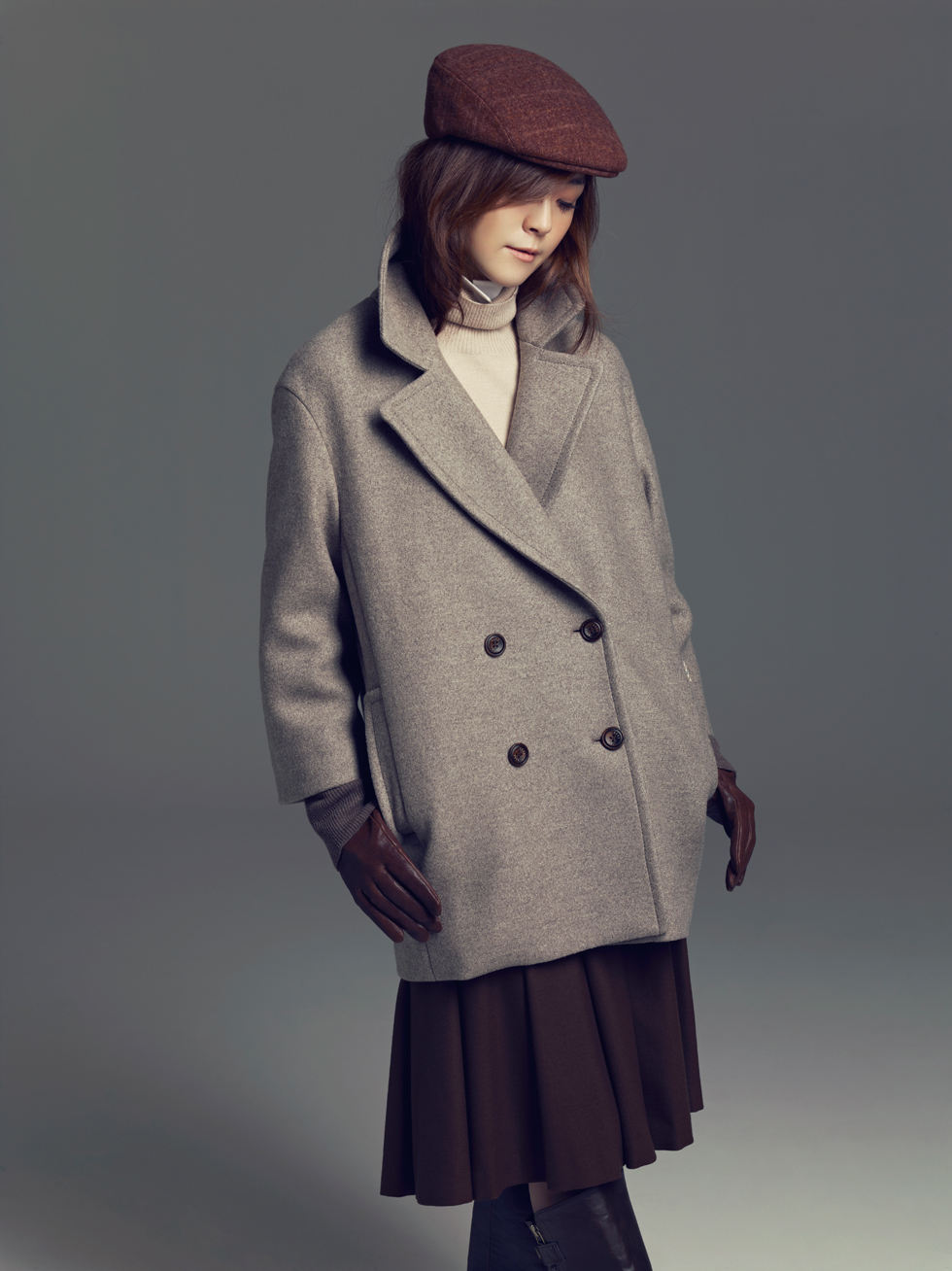 3 소매 부분에 니트 핸드 워머가 달린 박시한 실루엣의 더블 브레스티드 코트에 플레어스커트를 매치했다. 장갑과 모자 등 소품을 활용하면 완벽하다.