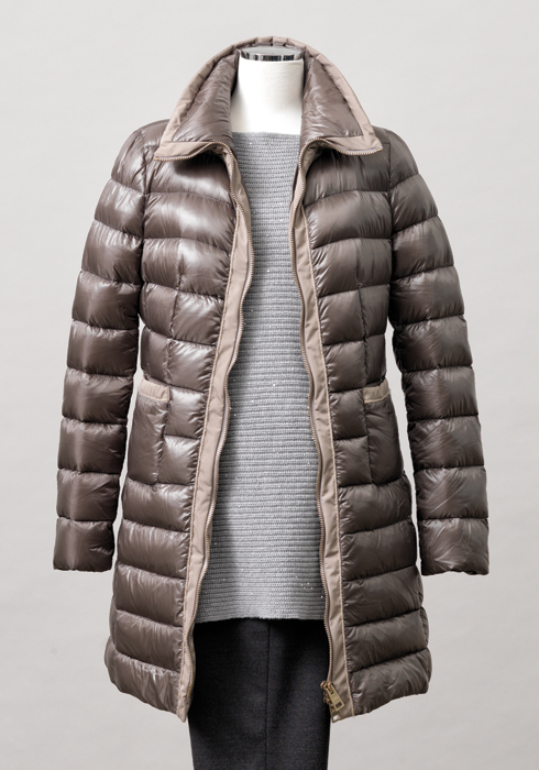 늘 입어도 질리지 않는 데일리 패딩 룩. 캐시미어를 걸친 듯 가볍고 보온성이 뛰어난 롱 패딩은 포켓과 지퍼 부분에 톤온톤 컬러를 덧댄 감각적인 디테일이 돋보인다. 은은한 비즈 장식의 그레이 롱 니트와 팬츠를 매치하면 우아하면서도 차분한 룩을 완성할 수 있다.