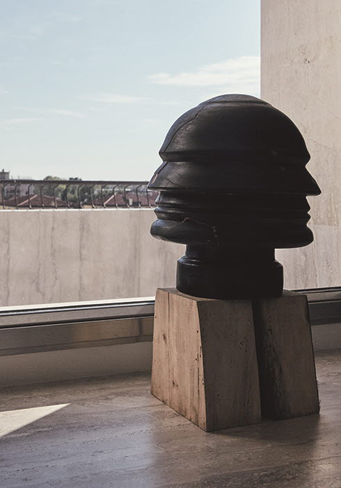1 베니스 리도 섬에 있는 릭 오웬스(Rick Owens)의 아파트식 별장에 놓인 이탈리아 미래주의 두상 작품. 레나토 베르텔리(Renato Bertelli)의 ’Profilo Continuo’(1933).