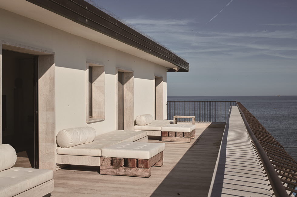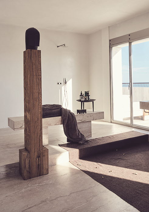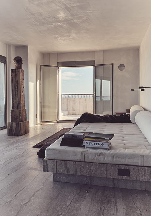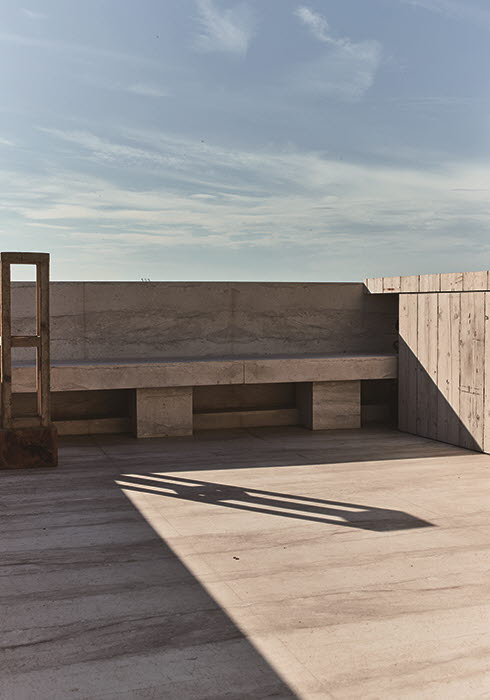 4 햇빛이 기분 좋게 감기는 릭 오웬스의 아파트 건물 옥상 테라스(rooftop terrace). 이곳과 아파트 바닥에 사용한 재료는 지중해 사르데니아(Sardinia) 섬의 브레시아 사르다(Breccia Sarda) 대리석이다.