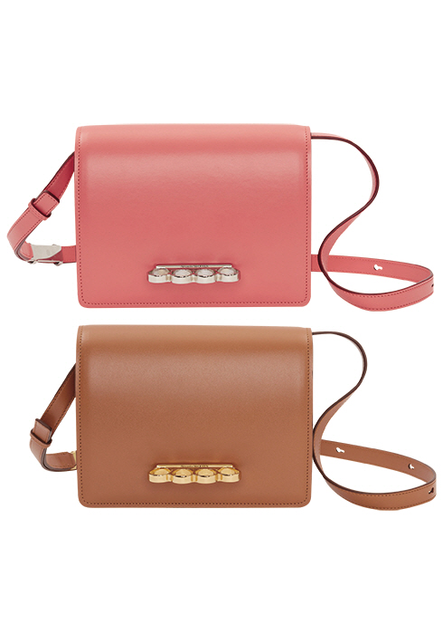 마치 반지를 착용한 듯, 플랩 부분에 손을 끼워 넣어 연출할 수 있어 매력적인 알렉산더 맥퀸의 포 링 백이 한층 모던한 모습으로 돌아왔다. 텍스처가 매끈한 송아지가죽으로 제작해 고급스러운 인상은 유지하면서, 메탈 손잡이 부분의 장식을 덜어내 군더더기 없이 간결하며 시크한 매력을 강조한다. 블랙과 아이보리, 텐 등 시그너처 컬러 구성에 코럴 컬러를 추가한 싱그러운 라인업으로 선보인다. 2백15만원. 문의 02-6905-3472