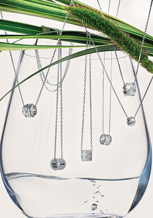 모던한 3개의 패싯 화이트 골드 밴드 양옆에 다이아몬드를 세팅해 여성스러운 무드를 배가한 펜던트 1천4백46만원. 문의 02-2150-2320