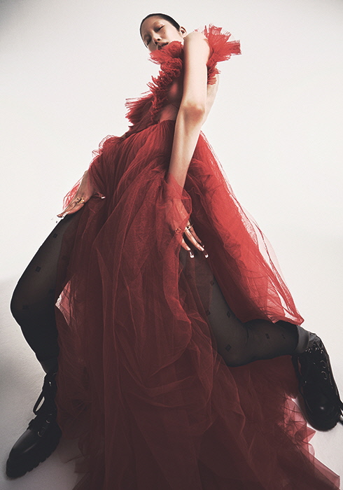 레드 하트 튈 맥시 드레스, 블랙 램 스킨 디-플라잇 로 부츠, 오른손 검지에 착용한 블루 래커 포인트 디올 드림 링 모두 가격 미정 디올.