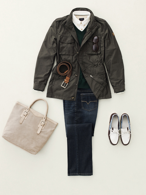 도시의 젠틀맨을 위한 갤럭시 라이프스타일의 시티 사파리 룩. 데님 팬츠가 허락되는 금요일의 비즈니스 캐주얼룩으로도 손색없다. 짙은 카키 컬러 사파리 재킷에 화이트 버튼다운 셔츠, 딥 그린 브이넥 스웨터, 데님 팬츠를 매치한다. 여기에 위빙 벨트와 선글라스, 보트 슈즈와 토트백을 매치하면 보다 세련된 스타일을 연출할 수 있다.