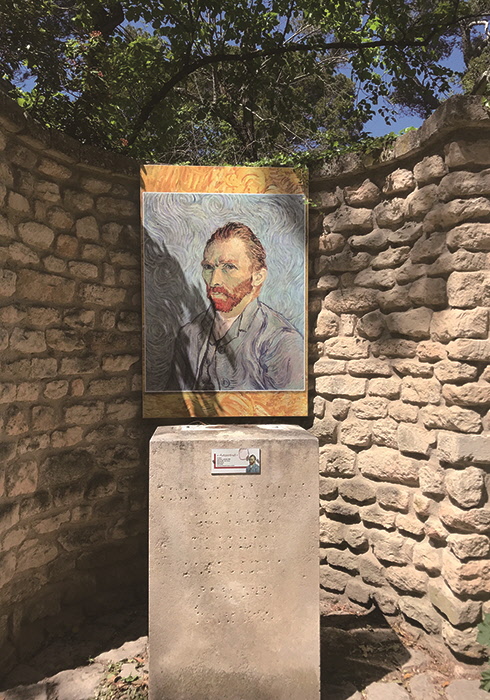 고흐표 그림 패널과 함께 여기저기를 여유롭게 감상하면서 걷다 보면 어느덧 생폴 드 무솔의 팻말이 보이고, 고뇌하는 표정의 고흐 동상이 모습을 드러낸다. 이 건물 안팎에서도 역시 그의 흔적이 여기저기 눈에 들어온다. 그가 그린 건물, 아이리스, 올리브나무 그림을 비롯해 하늘색 배경에 당근빛 수염, 맑고 허무한 눈동자가 인상적인 그의 유명한 자화상이 프린트된 패널도 있다. 화창한 날씨 덕에 더 그런 것도 있었겠지만, 12세기 수도원 건물이라 그런지 이 요양원은 꽤 운치 있었다. 회랑 자체는 어두컴컴해 흐린 날에는 스산하겠다는 생각이 들었다. 하지만 사각형 중정이 있는 안뜰의 소담스러운 화단은 빛을 머금으면 천진난만하게 미소 짓는 듯하다. 마치 가까스로 스스로를 다잡으며 그림을 그려나가다 다시 우울에 빠지곤 했던 고흐의 대비되는 마음 상태처럼. 어쨌거나 그에게는 동생 테오의 배려로 치료를 받으며 묵었던 병실과 별도로 작업실로 썼던 방도 주어졌고, 그는 그림에 몰두했다.