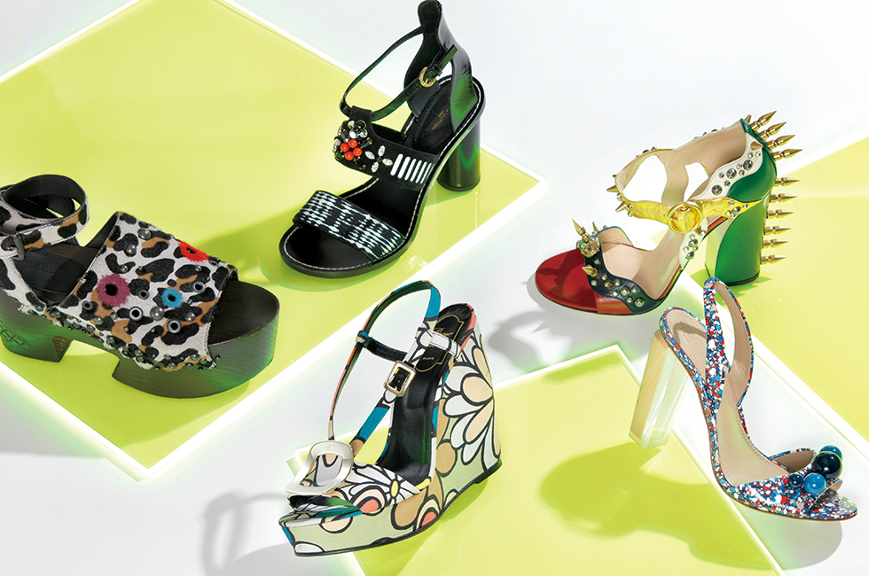 주얼 패치워크 장식의 피어 샌들 힐 1백30만원대 루이 비통. 뾰족한 스터드로 장식해 강렬하고 대범한 디자인이 특징인 샌들 1백73만원 구찌.