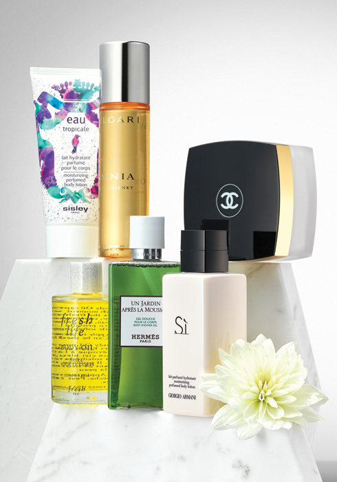 로맨틱한 순간을 위해 필요한 것은? 섹시한 란제리, 그리고 보드랍고 매끄러운 보디 피부다. 이때 후각을 자극하는 관능적이고 여성스러운 향까지 은은하게 풍긴다면 게임 끝. (왼쪽 위부터 시계 방향으로) ‘시슬리 오 뜨로삐깔 모이스처라이징 퍼퓸드 바디로션’은 열대 과일과 풍성하게 만발한 꽃이 가득한 이국적인 여행지를 연상케 하는 플로럴 시트러스 계열의 보디 제품. 가볍고 산뜻하지만 크리미한 질감의 플루이드 텍스처는 피부에 촉촉하게 스며들어 기분 좋은 상쾌함을 남기는 것이 특징이다. 제품을 바른 후 바로 옷을 입을 수 있을 만큼 빠르게 흡수된다. 단독으로 사용하면 은은한 싱그러움을, 오 뜨로삐깔 향수와 함께 사용하면 강렬하고 관능적인 향을 즐길 수 있다(150ml 9만5천원). ‘불가리 옴니아 인디안 가넷 뷰티 오일 포 바디’는 인도에서 온 매혹적이고 신성한 오렌지 컬러의 보석, 만다린 가닛의 프레시한 향과 관능미 있는 인디안 튜베로즈가 조화를 이뤄 이국적이면서 신비로운 향취가 돋보인다. 오일이지만 끈적임 없이 빠르게 흡수되고, 수분 보호막을 형성해 피부를 촉촉하고 매끄럽게 가꿔준다. 은은한 향이 하루 종일 지속되기 때문에 향수가 부담스러운 사람이라면 더욱 만족할 수 있을 것(100ml 6만8천원). ‘진정한 여성을 위한 향수’라 불리는 No.5의 섬세한 향을 담은 ‘샤넬 No.5 보디 크림’. 과거 최음제로 사용했을 만큼 관능적인 향의 일랑일랑, 그라스산 재스민, 5월의 장미 노트가 어우러진 파우더리한 향이 특징으로, 향수만큼이나 풍부한 향을 자랑한다(150g 12만3천원). 브랜드의 베스트셀러 향수인 씨 로즈 시그니처의 우아한 로즈 향을 데일리로 즐길 수 있도록 만든 ‘조르지오 아르마니 씨로즈 시그니처 보디로션’은 탐스러운 한 송이 장미처럼 로맨틱하고 페미닌한 향을 선사한다. 피부에 가볍고 산뜻하게 흡수되면서 보습력은 오래 지속된다는 것 역시 장점이다(200ml 7만6천원대). 라임, 진저, 우디, 베티베르 등이 조화를 이뤄 그린 플로럴 계열의 향조를 완성한 ‘에르메스 운 자르뎅 아프레 라 무쏭바디 샤워 젤’은 샤워를 하는 동안에도 감각적인 향을 만끽할 수 있는 럭셔리 보디 케어 제품으로, 풍성하고 부드러운 거품과 실키한 사용감이 단연 돋보인다. 반신욕을 할 때 이 샤워 젤을 소량 물에 풀면 향긋한 입욕제 대용으로 사용할 수 있다(200ml 6만6천원). ‘프레쉬 라이프 보디 오일’은 벨벳 베르가모트, 그레이프 프루트, 라일락 잎 등을 더해 푸른 하늘의 상큼함, 달콤한 아침의 향기, 반짝이는 태양의 기운, 그리고 벨벳처럼 부드러운 물의 느낌을 모두 담았다. 피부를 유연하게 하는 오일 성분을 블렌딩해 피부를 촉촉하게 유지시킴과 동시에 최상의 향을 지속적으로 경험할 수 있게 도와준다(100ml 8만2천원대).