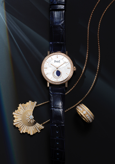 (왼쪽부터 차례대로) 선라이트 팰리스 데코 펜던트 태양을 가장 중요한 모티브 중 하나로 여기는 피아제에서 선라이트 컬렉션은 60년간 축적된 노하우를 응축했다고 해도 과언이 아니다. 18K 핑크 골드 소재의 펜던트 센터에는 약 0.35캐럿의 브릴리언트 컷 다이아몬드가 중심을 잡고 있으며, 그 주변으로 약 0.9캐럿의 1백58개 브릴리언트 컷 다이아몬드를 세팅해 화려함을 더했다. 가격 미정. 알티플라노 문페이즈 36mm 심플함의 정수를 보여주는 알티플라노 워치. 18K 핑크 골드 소재의 울트라-신 케이스에 약 0.94캐럿의 74개 브릴리언트 컷 다이아몬드와 약 3.23캐럿의 머더오브펄 다이얼을 매치했다. 6시 방향에 세팅한 피아제 자체 제작 580P 문페이즈 인디케이터가 포인트. 5천3백만원. 포제션 팰리스 데코 링 회전하는 모티브를 담아 경쾌함을 표현하는 포제션 컬렉션의 링. 18K 핑크 골드 소재로, 중앙에는 약 0.08캐럿의 브릴리언트 컷 다이아몬드를, 전체에는 약 1.93캐럿의 68개 브릴리언트 컷 다이아몬드를 세밀하게 세팅했다. 2천10만원.