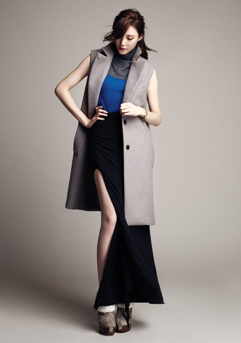 뉴트럴 톤의 울 베스트 코트 3백65만원 끌로에. 블랙 롱 스커트 80만원대 릭 오웬스. 양털 디테일이 포인트인 스웨이드 소재 앵클부츠 1백45만8천원 펜디. 핑크 베이지 새틴 스트랩이 우아한 캡티브드 까르띠에 워치 4천2백만원대 까르띠에.