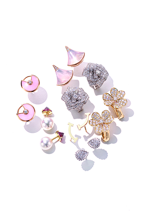서약의 자물쇠를 연상케 하는 유니크한 디자인에 핑크 오팔 원석을 더한 아뮬레뜨 드 까르띠에 이어링 5백10만원대 까르띠에. 기하학적인 부채 모티브가 유니크한 디바스 드림 이어링 2백만원대 불가리. 약 2.8캐럿의 다이아몬드를 세팅한 로즈 이어링 3천3백만원대 피아제. 하트 모양의 꽃잎을 입체적으로 디자인한 프리볼 컬렉션 다이아몬드 이어 클립 1천8백만원대 반클리프 아펠. 물방울 모양이 우아한 쎄뻥 컬렉션 다이아몬드 이어링 5백만원대 부쉐론. 티파니의 ‘T’ 이니셜을 스마일 모티브로 위트 있게 디자인한 티파니 T 스마일 이어링 80만원대 티파니. 진주 혹은 가닛을 앞뒤로 교체해서 착용할 수 있는 리파인드 리벨리온 가닛 이어링 3백만원대 타사키.