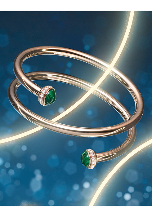 03 포제션 오픈 뱅글 트위스티드 눈부신 브릴리언트 컷 다이아몬드를 파베 세팅한 2개의 밴드가 회전하는 ‘포제션 오픈 뱅글 트위스티드.’ 양쪽 끝에서 선명하게 빛나는 카보숑 컷 말라카이트와 우아한 18K 핑크 골드 뱅글이 화려한 대비를 이루며 어느 스타일링에서나 포인트 역할을 한다.