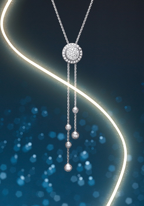 18K 화이트 골드 체인에 총 55개에 이르는 브릴리언트 컷 다이아몬드를 세팅했다. 중앙에 다이아몬드를 세팅한 회전 밴드와 다이아몬드 세팅의 슬라이딩 파베 카보숑, 양 끝에 달린 5개의 화이트 골드 비즈가 화려함의 극치를 선보인다.