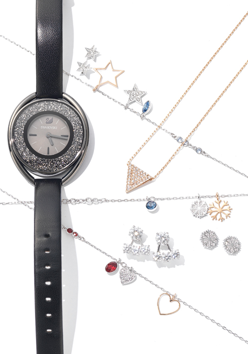 부드러운 곡선형 베젤에 약 1천7백 개의 라이트 골드 톤 크리스털을 세팅한 크리스털린 오벌 워치 블랙 51만원, 스타 모티브 펜던트와 체인, 크리스털을 세팅한 이어링으로 구성된 듀오 스타 네크리스 세트 18만5천원, V자 펜던트를 탈착해 두 가지 다른 스타일로 연출할 수 있는 델타 네크리스 스몰 로즈 골드 16만5천원, 앙증맞은 눈송이 모티브의 골드 펜던트와 크리스털 펜던트 네크리스, 이어링으로 구성된 듀오 스노우 네크리스 세트 18만5천원, 스터드형 이어링과 이어링 재킷을 부착한 어트렉트 투웨이 이어링 14만5천원, 심플한 하트 펜던트에 강렬한 레드 크리스털로 포인트를 준 듀오 펜던트 하트 13만원 모두 스와로브스키.