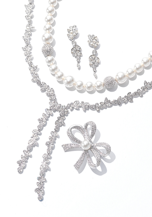 클리어 크리스털로 아름다운 얼음꽃 모양을 완성한 디아파종 이어링 16만5천원, 진주와 크리스털을 파베 세팅한 캐노피 올 어라운드 네크리스 35만원, 크리스털 얼음꽃이 폭포수처럼 떨어지는 듯한 디아파종 올 어라운드 네크리스 워터폴 46만원, 은은한 크리스털 진주를 중앙에 세팅한 도라 브로치 20만5천원 모두 스와로브스키.
