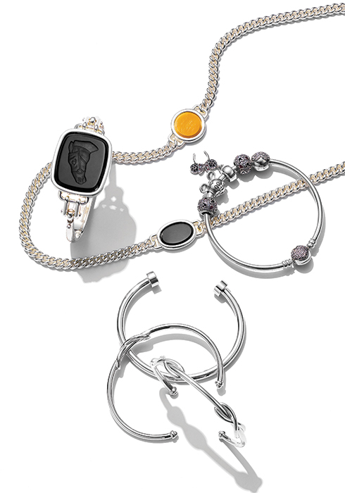 블랙 오닉스와 옐로 재스퍼가 실버 체인을 더욱 빛나게 하는 네크리스 5백만원대, 말의 얼굴 모양을 음각으로 새긴 쉐바췌 컬렉션 브레이슬릿 4백만원대 모두 에르메스. 미키마우스 참이 달린 디즈니 컬렉션 브레이슬릿 60만원대 판도라. ‘리턴 투 티파니’ 메시지가 각인된 서클 엣지 커프 60만원대, 무한대 기호에서 영감을 받은 인피니트 커프 60만원대, 2개의 매듭으로 장식한 인피니트 더블 커프 70만원대 모두 티파니.
