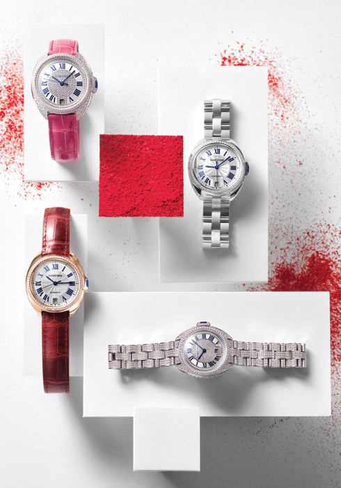케이스와 다이얼 전체에 다이아몬드를 파베 세팅하고, 까르띠에의 시그너처가 된 핑크 앨리게이터 스트랩을 매치해 클래식한 매력을 담은 끌레 드 까르띠에 주얼리 워치. 6시 방향의 날짜창을 확인할 수 있다. 케이스 사이즈가 35mm로 볼드한 매력도 느낄 수 있다. 매혹적인 버건디 컬러의 앨리게이터 스트랩과 베젤에 다이아몬드를 세팅한 핑크 골드 케이스로 귀족적인 매력을 완성한 끌레 드 까르띠에 주얼리 워치. 블루 사파이어를 세팅한 크라운과의 컬러 대비가 매력적이다. 1847MC 무브먼트를 장착했다. 다이아몬드 가루를 흩뿌린 듯 다이얼부터 케이스, 밴드까지 브릴리언트 컷 다이아몬드를 빼곡하게 세팅한 끌레 드 까르띠에 하이 주얼리 워치. 하이 주얼리 브랜드로서 까르띠에의 노하우가 고스란히 담긴 모델로, 수많은 다이아몬드를 세팅했음에도 실크처럼 매끄럽다. 오토매틱 와인딩 무브먼트를 장착했다. 심플하고 유려한 매력을 단순하게 담아낸 화이트 골드 소재의 끌레 드 까르띠에 주얼리 워치. 베젤에 세팅한 다이아몬드의 반짝임마저 은은하게 느껴진다. 케이스 직경은 35mm이며, 42시간의 파워 리저브 기능을 갖췄다.