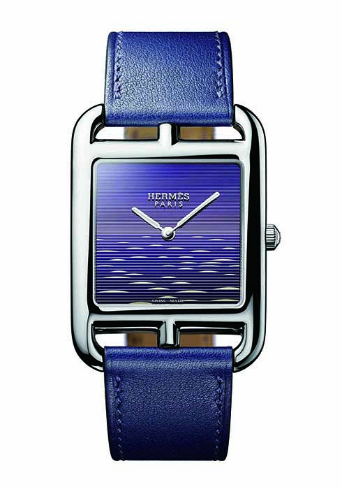 하프 앵커 체인, 직사각형 케이스와 정사각형 다이얼의 조합이 아이코닉한 케이프 코드. 여기에 에르메스 특유의 미학적 요소를 강조하는 다이얼을 선보이는 케이프 코드 크레프스큘 라인의 신제품을 소개한다. 그래픽 아티스트 탄-퐁 레의 작품 ‘황혼’을 담아낸 매혹적인 비주얼로 나노 기술과 결합한 신비로운 제품이다. 마이크로 전자 기술을 기반으로 하는 반도체 재료인 실리콘 웨이퍼를 캔버스로 삼아 미묘하고 독특한 색조를 나타내며, 에르메스 시계 공방에서 제작한 네이비 블루 송아지가죽 스트랩을 장착해 하이엔드의 품격을 부여했다. 6백만원대. 문의 02-542-6622