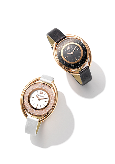 (오른쪽 위부터) 블랙 크리스털 베젤로 시크함을 더한 크리스털린 오벌 로즈 골드 블랙 54만5천원, 곡선 형태의 베젤에 약 1천7백 개의 크리스털을 세팅한 크리스털린 오벌 로즈 골드 화이트 54만5천원 모두 스와로브스키.