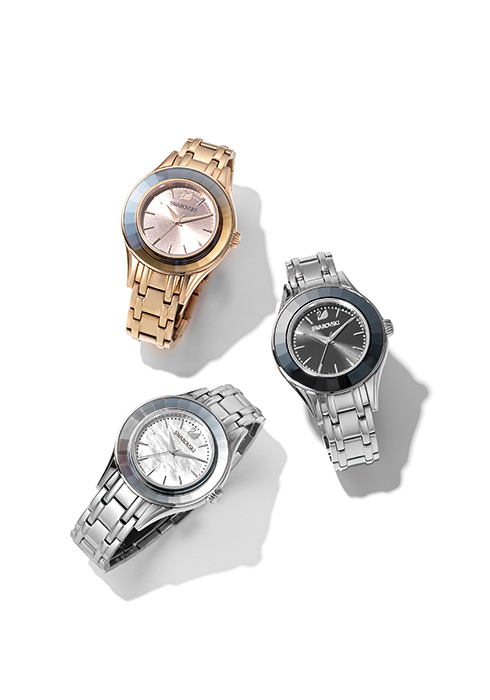 (왼쪽 위부터 시계 방향으로) 빛이 비치는 방향에 따라 은은한 광채를 발하는 크리스털 베젤이 매력인 알레그리아 로즈 골드 63만원, 블랙 다이얼로 강인한 여성의 매력을 담은 알레그리아 블랙 54만5천원, 모던한 형태의 케이스에 클래식한 메탈 소재를 더한, 데일리로 착용 가능한 알레그리아 화이트 워치 54만5천원 모두 스와로브스키.