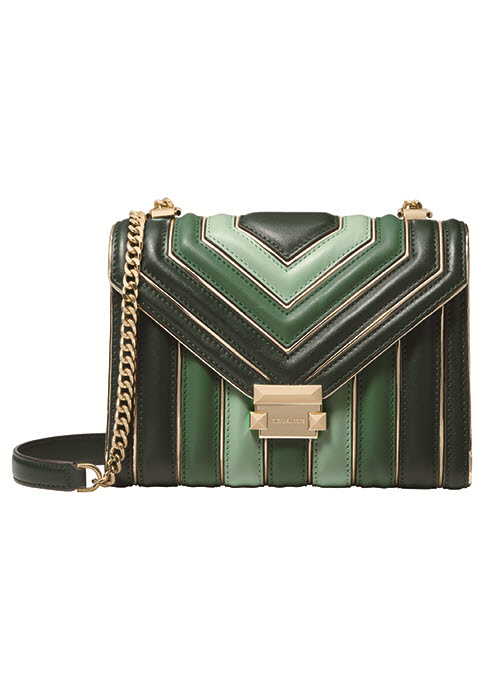 톤온톤 세 가지 컬러를 조합한 ‘트라이 컬러 패널 퀼팅 폴리시드 레더’ 위트니 59만원, 장미꽃 패턴을 누빈 ‘페탈 퀼티드 폴리쉬드 레더’ 위트니 59만원 모두 마이클 코어스.