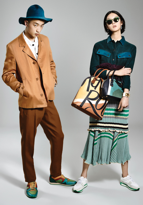 (남) 오렌지 컬러 재킷 2백30만원대, 화이트 데님 자켓 1백40만원대, 브라운 팬츠 1백65만원 모두 버버리 프로섬. 멀티컬러 스니커즈 86만원, 에메랄드 컬러 버킷 햇 49만원 모두 버버리.