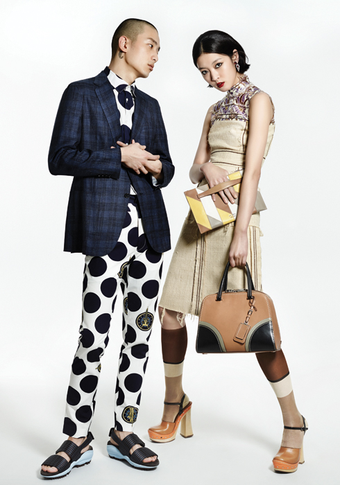 (남) 네이비 체크 재킷 5백60만원 브리오니. 도트 패턴 셔츠 49만원, 팬츠 75만원 모두 겐조 옴므. 네이비 샌들 가격미정 랑방. (여) 자카드 장식 탑 가격미정, 베이지 컬러 스커트 가격미정, 니삭스 가격미정 모두 프라다. 브라운 소가죽 피라미드 백 2백80만원, 패턴 사각 클러치 가격미정, 블랙 라인 우드 힐 가격미정, 레드 포인트 이어링 가격미정 모두 프라다. |