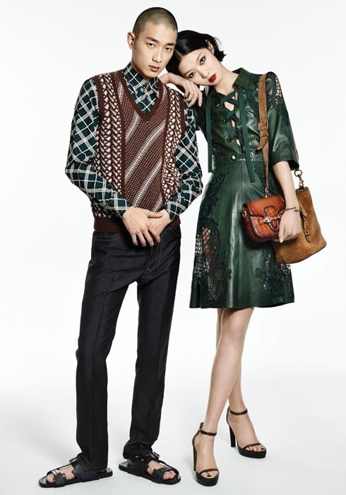 (남) 그린 체크 셔츠 70만원대, 브라운 컬러 니트 베스트 가격미정, 데님 팬츠 80만원대, 블랙 샌들 가격미정 모두 프라다. (여) 그린 컬러 레더 원피스 가격미정, 클러치로 든 숄더 백 가격미정, 브라운 숄더 백 가격미정 모두 구찌. 블랙 스트랩 힐 가격미정 에르메스. 블랙 브레이슬릿 28만5천원. |