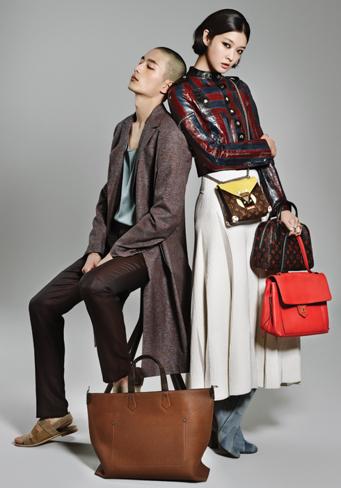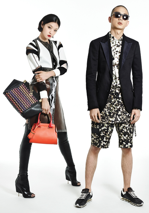 (여) 플라워 패턴 미니 원피스 3백만원대, 블루 피카부 토트 백 3백19만원, 마이크로 미니 피카부 백 1백77만원 모두 펜디. 네이비 와이드 팬츠 가격미정, 화이트 슈즈 가격미정 모두 셀린. 어깨에 맨 실버 숄더 백 2백만원대 지방시. 골드 뱅글 90만원대 토즈. (남) 핫핑크 컬러 점퍼 가격미정, 기하학 패턴 셔츠 가격미정, 네이비 팬츠 가격미정 모두 루이비통, 화이트 스니커즈 가격미정 프라다. |