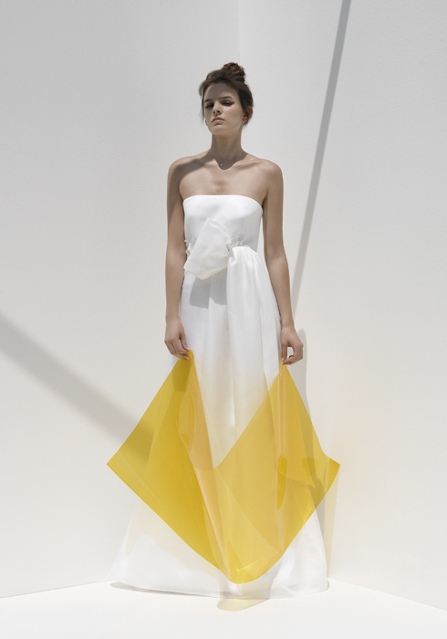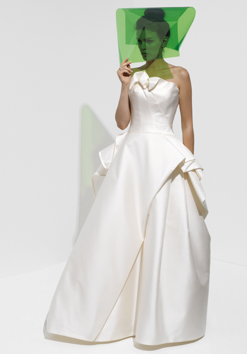 기하학적인 구성으로 접은 듯한 느낌을 주는 유니크한 실루엣의 숄더리스 실크 드레스. 사랑스러운 신부를 표현했다. 드레스 Peter Langner.