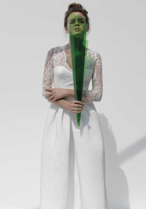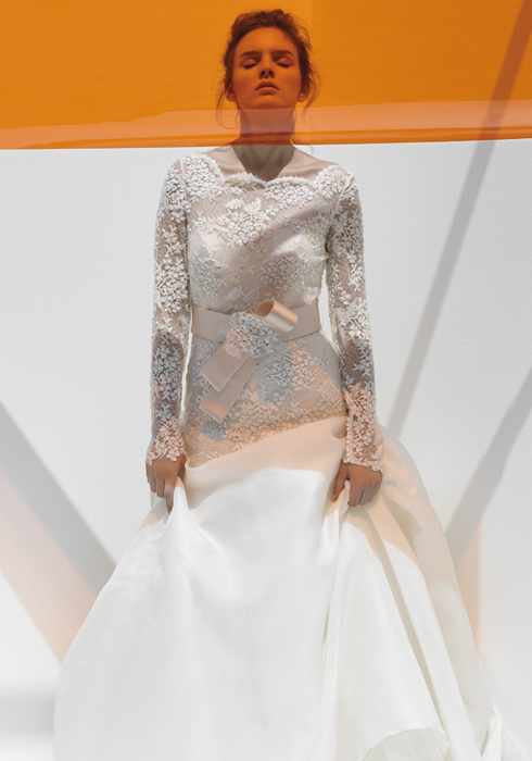 군더더기 없이 깔끔한 실루엣의 웨딩드레스. 살포시 겹친 꽃잎 같은 스커트와 레이스 소재의 어깨, 칠부 소매가 귀여운 느낌을 강조한다. 거기에 깊고 좁게 파인 네크라인으로 섹시한 매력을 돋보이게 했다. 드레스 Atelier Pronovias.
