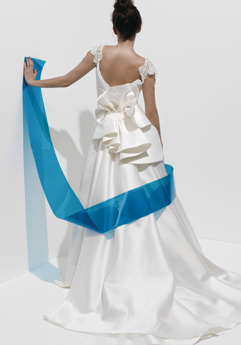 늘씬한 라인을 강조하는 심플한 매력의 웨딩드레스. 허리선을 높인 엠파이어 실루엣이 귀족적인 분위기를 연출한다. 허리의 꽃과 프릴 장식만으로 눈길을 사로잡는다. 드레스 Acquachiara Collection Milano.