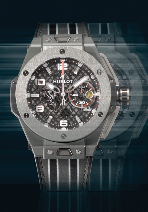 올해 페라리와 파트너십을 맺어 새롭게 선보이는 컬래버레이션 워치인 빅뱅 페라리 그레이 세라믹. 페라리 그릴에서 영감을 받은 블랙 메시 스타일 다이얼이 가장 큰 변화다. 백 케이스를 통해 페라리의 상징인 5스포크 휠 디자인 로터의 움직임을 볼 수 있다. 3천5백만원대.