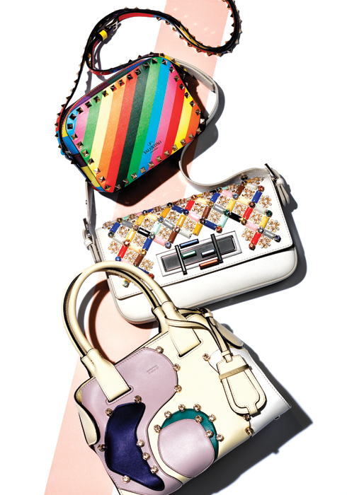 Jewel point(위부터 아래로) 발렌티노 1973 미니 락 백 by 무이 다채로운 스트라이프를 규칙적으로 배열한 패턴과 스터드 장식이 강렬하고 경쾌한 룩을 완성하는 미니 스트랩 백. 19X13cm 1백83만원. 문의 02-3446-8074 펜디 트레바게트 백 펜디의 상징인 바게트 백을 재해석한 컬렉션으로, 옆으로 돌리면 작은 선으로 흩어지며 모습을 바꾸는 버클이 핵심 모티브다. 27X16cm 5백42만원. 문의 02-2056-9023 토즈 케이프 백 케이프 코트에서 영감을 받은 유연한 실루엣과 기하학적인 패턴, 주얼 장식이 우아하게 어우러진 화이트 토트백. 27X20cm 3백50만원대. 문의 02-3438-6008 Party Chic(위에서부터 아래로) 델보 마담 미니 갈루샤 백 모던한 직사각형 디자인의 미니 숄더백. 폴로 가죽에 텍스처가 독특한 가오리가죽을 매치해 세련미를 더했다. 18X16cm 4백만원대. 문의 02-3449-5916 로저 비비에 미스 비브 미니 백 1950년대 스타일에서 영감을 받은 정사각형 디자인과 네모난 버클이 눈에 띄는 핑크 컬러의 토트 겸용 숄더백. 16.5X16cm 2백49만원. 문의 02-6905-3370 루이 비통 말리 백 우아한 실루엣, 넉넉한 수납공간과 탄탄한 소재로 실용성을 갖춘 토트백. 탈착 가능한 스트랩이 있다. 35X24cm 3백만원대. 문의 02-3432-1854