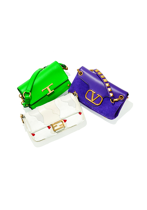 패션 일러스트레이터 안토니오 로페즈의 그래픽을 핸드메이드로 한 땀 한 땀 새겨 넣은 펜디의 아이코닉한 미디엄 바게트 백 7백만원대 펜디. 문의 02-514-0652. 토즈의 T 로고 버클이 매력적인 카프레더 소재의 토즈 T 타임리스 백 2백50만원대 토즈. 문의 02-3438-6008. 골드 컬러의 V 로고 버클로 임팩트를 준 퍼플 컬러 염소가죽 소재의 스터드 사인 백 3백40만원 발렌티노 가라바니. 문의 02-2051-4653