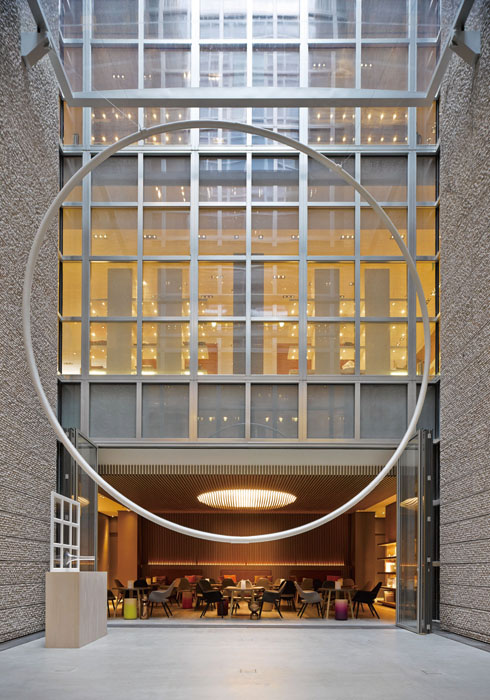 1 서울의 도산 메종 지하 1층 카페는 건물의 심장부라 할 수 있는 중앙의 지하에서부터 길게 뻗은 아트리움과도 연결된다. 맞은편은 전시 공간인 아뜰리에 에르메스로 흰색 벽과 회색 콘크리트의 혼합체로 완성되었다.