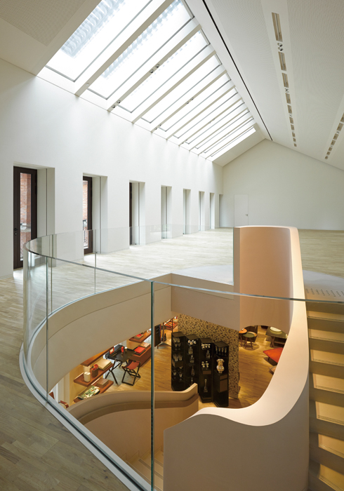6 상하이 메종의 내부는 따뜻하고 친숙한 컬러의 베네치안 석회로 마감했고, 내부는 고요하지만 시원하게 오픈되어 있다. 각 층의 공간은 에르메스 부티크의 특징인 계단으로 나누어져 있는데, 계단은 용처럼 완만한 커브를 그리며 뻗어나간다.