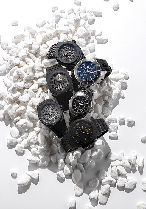 케이스와 다이얼, 브레이슬릿과 디폴로이언트 버클 등 모든 부품을 샌드 블라스트 처리한 하이테크 세라믹으로 제작했다. 두께 약 2.35mm의 초박형 모델로 팔각 케이스 안에서 복잡 정교한 무브먼트의 움직임을 감상할 수 있다. 3천1백만원대. 문의 02-2056-0170
