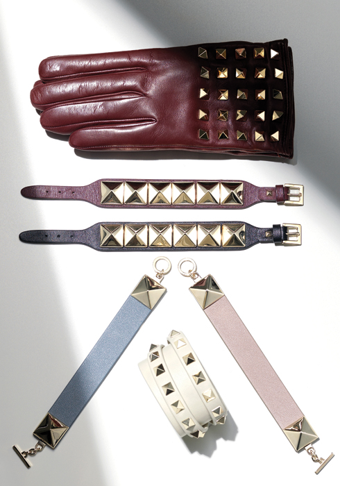 ‘발렌티노’ 하면 스터드를 떠올릴 만큼 브랜드의 상징이 된 피라미드 형태의 스터드 장식을 더한 아이템은 클래식한 디자인과 모던함이 공존하고, 과하지 않지만 이목을 끌기에 충분하다. (위에서 아래로) 스터드 장식의 송아지가죽 장갑 73만원. 큼직한 스터드가 눈에 띄는 브레이슬릿. 버클을 채우는 형식으로 사이즈 조절이 가능하다. 버건디와 블랙 모두 33만원. 은은한 파스텔 톤이 사랑스러운 밴드 형식의 브레이슬릿 모두 33만원. 작은 스터드 장식이 촘촘히 박힌 화이트 브레이슬릿 37만원. 모두 발렌티노 가라바니. 지금 가장 트렌디한 패션 피플의 스트리트 컷에 항상 함께하는 것은 발렌티노의 락스터드 백과 슈즈. (위에서 아래로) 버건디 컬러의 마이 락스터드 백 스몰 사이즈 2백80만원, 은은한 광택의 송아지가죽을 사용한 락스터드 부티. 내구성이 좋은 나파 가죽 스트랩에 스터드로 시크한 무드를 가미했다. 1백50만원. 모두 발렌티노 가라바니.