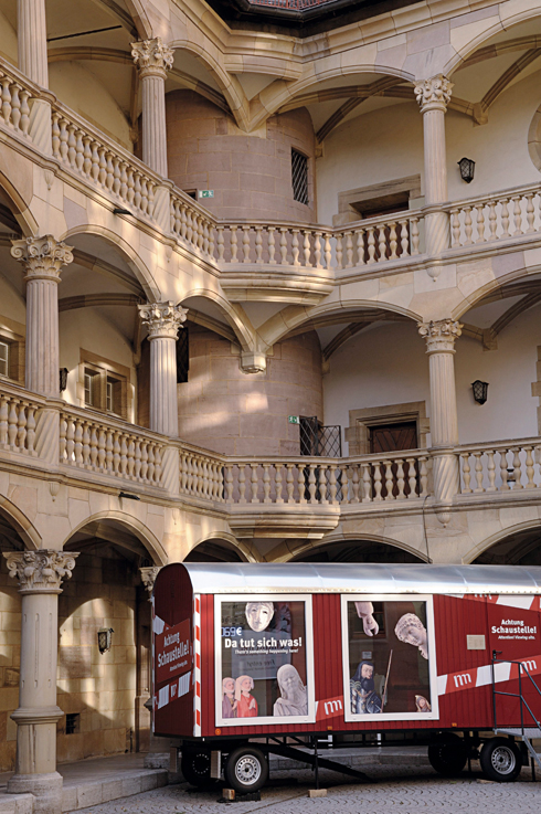7 르네상스 시대의 성 안뜰에서는 트레일러 1대가 새로운 전시의 입구를 가리키고 있다.