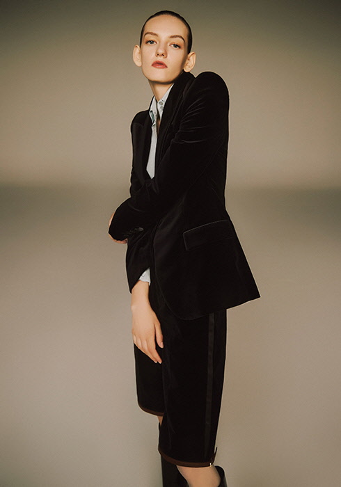 블랙 벨벳 재킷 3백90만원, 그레이 포플린 셔츠 1백56만원, 블랙 벨벳 하프 팬츠 2백만원 모두 구찌.