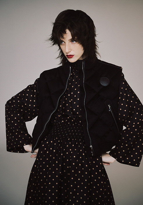 블랙 컬러 다운 베스트, 도트 패턴 실크 드레스 모두 가격 미정 에르메스.